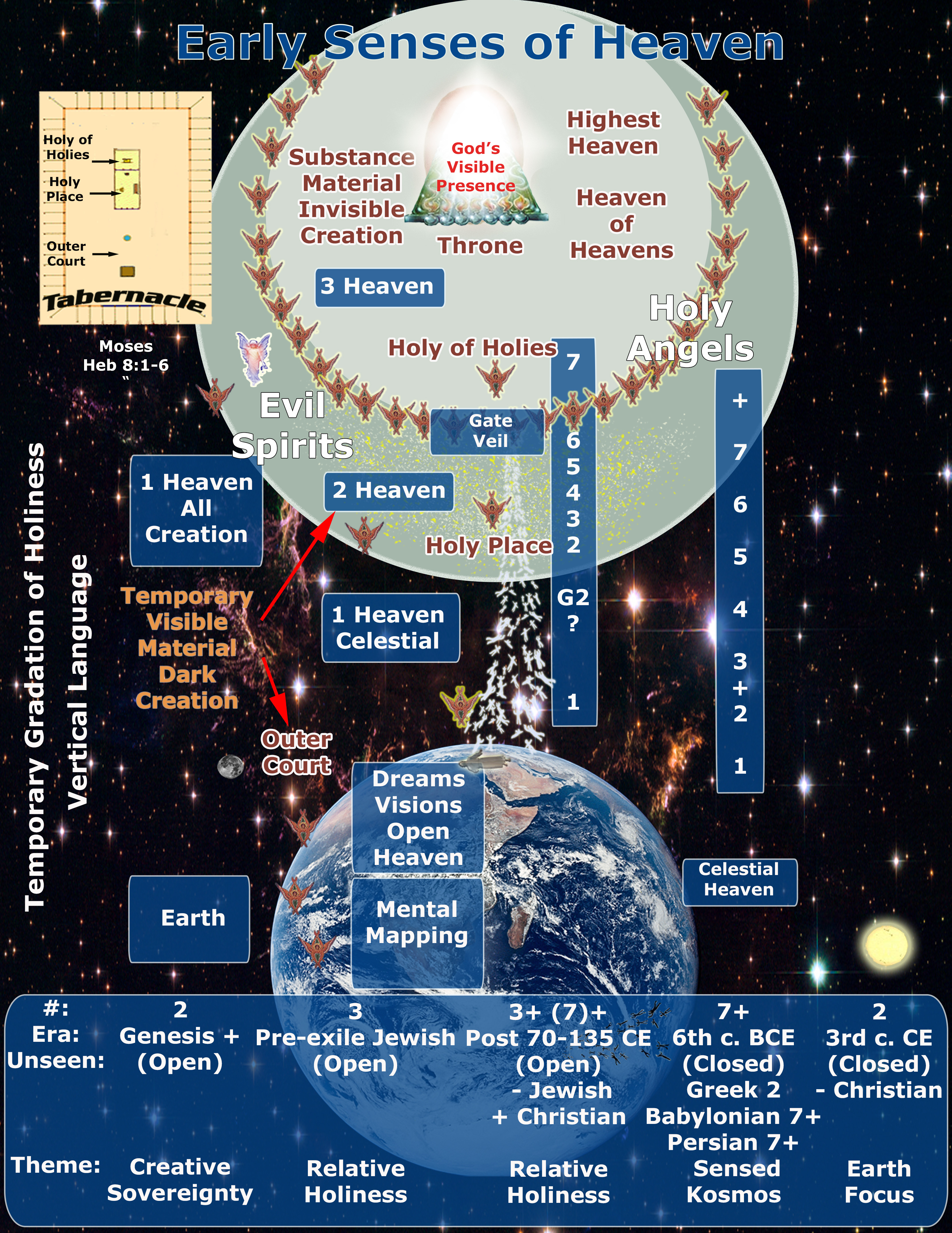 - Event 4, Heaven to Kosmos: Cf. PDF Dissertation, p. 72, ref. 126. The idea of spirit descent here as being into Hades after death was common among Roman and Greek mythology. However, for most Jews (with exception of the Sadducees mentioned above) and Christians in the first-century CE, the spirit after death ascended upwards to God in heaven for prompt judgment. The righteous entered heaven by faith in the Messiah, whereas the wicked with uncovered sin remained outside in outer darkness. The classical Christian idea of descent into Hades for Jesus and others to rescue the dead from hell developed later with the addition of Gentiles to the churches, a change from the concept of the true church/kingdom in heaven to a mistaken eternal kingdom on earth (Dan 7:13-14; John 18:36; Heb 1:8-9, 12:25-29), and subsequent need for another place for unbelievers besides the earthly destiny, since the errant kingdom was conceived to be on earth. I taught the classical view (link image The Present Heavens, v.3) from 1982 until 2014 until insights from a Masters Thesis about the proper structure of the plural heavens and Jesus's ministry as high priest that is symbolized in the OT tabernacle.
