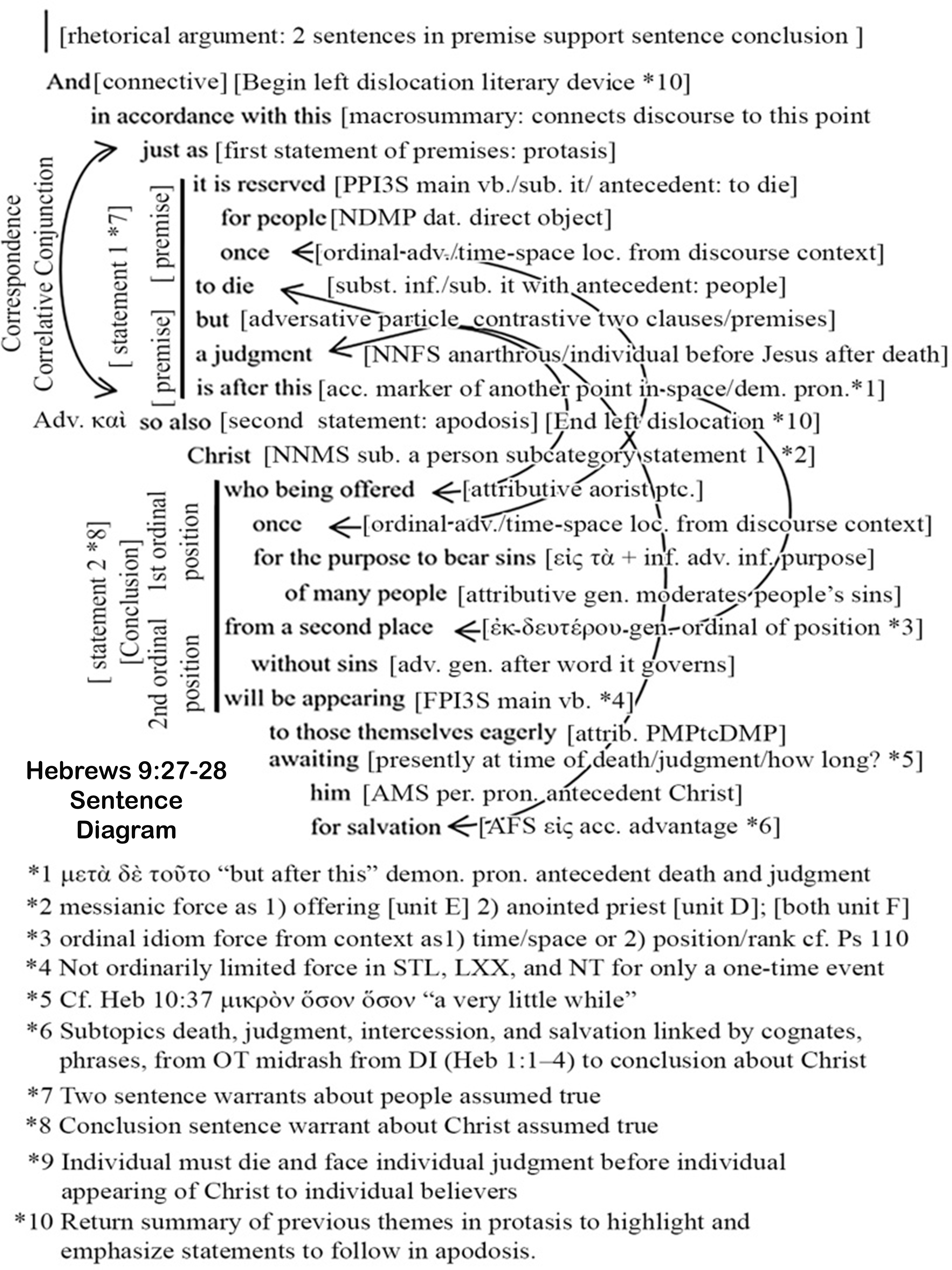 Between 66-70 CE, in two large discourse sections, the Pastor in the sermon to the Hebrews, exhorts his listeners concerning their teaching conversation about both the completed ministry of Christ in atonement for purification of sins (Heb 6:1-20) and his present ministry of intercession for his people at death and judgment (Heb 5:1-10; 7:1-28). His conclusion of his main discourse unit of exposition (Heb 8:1-10:18) summarizes both ministries of Christ (Heb 9:27-28, see Sentence Diagram). Midway into this midrash and message about Jesus's present ministry (Heb 5:1-10), the Pastor suddenly interrupts his flow of thought by making an astounding observation about his audience (Heb 5:11-14). He forms an analogy about the teaching content of the two ministries of Jesus using milk for infants and solid food for mature listeners. The Rudimentary Elements from the Beginning About the Ministry of ChristThe Pastor reminds his listeners about the beginning basic principles concerning the foundation of the ministry of Christ. He lists them in Hebrews 6:1-2 as: